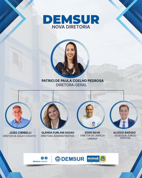 A Prefeitura de Muriaé anunciou neste fim de semana que o Demsur tem nova diretora, estando a frente da autarquia Patrici de Paula Coelho Pedrosa, como Diretora-Geral. Ela é tecnóloga em Gestão Ambiental e construiu sua trajetória profissional com foco na administração pública e na área ambiental. Iniciou sua atuação na Prefeitura de Rosário da Limeira, onde trabalhou na Secretaria de Educação entre 2004 e 2006.